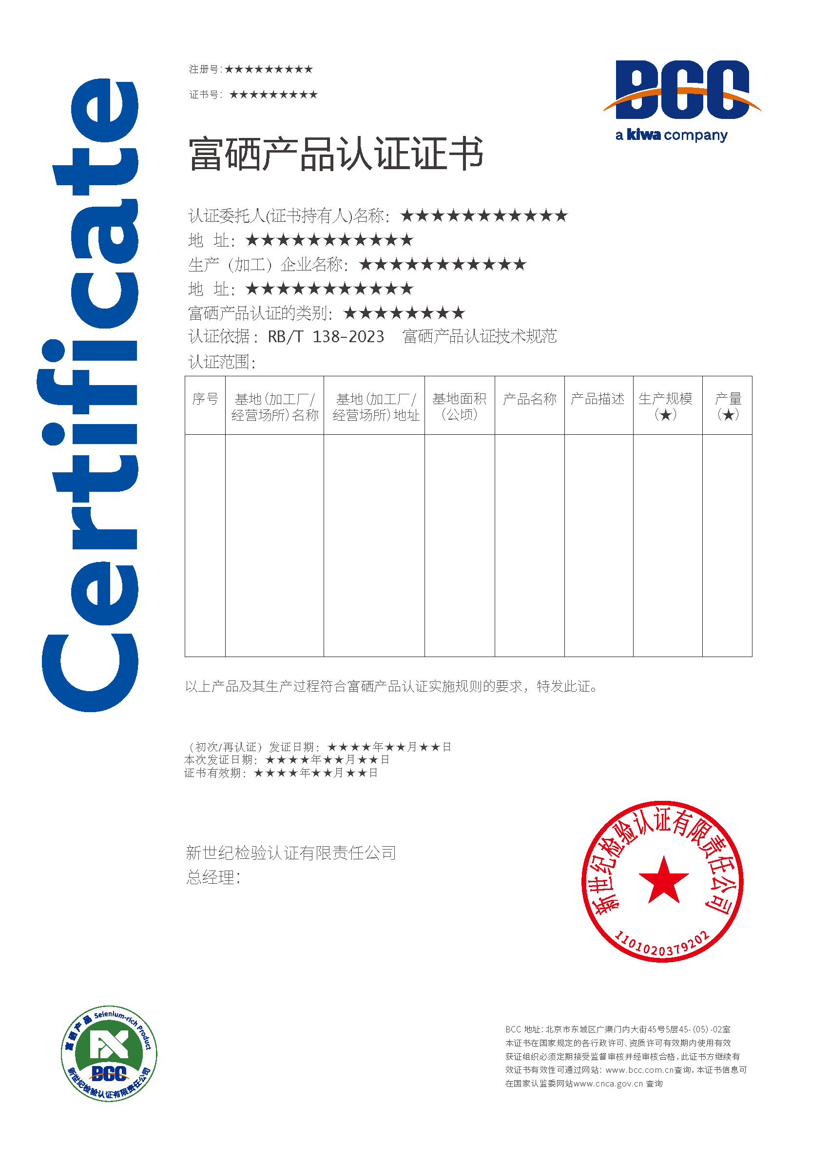 富硒產(chǎn)品認(rèn)證證書有效期最長為12個(gè)月。獲證組織應(yīng)至少在認(rèn)證證書有效期結(jié)束前3個(gè)月向BCC提出再認(rèn)證申請(qǐng)。