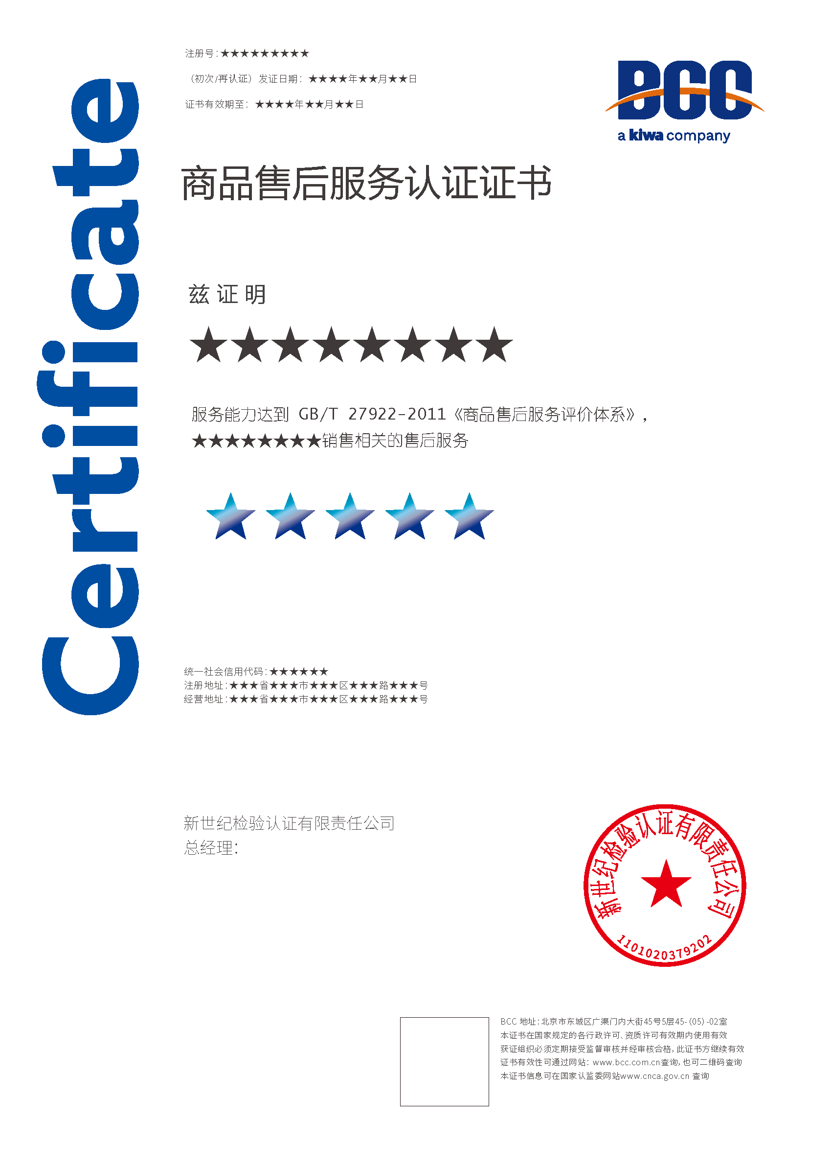 商品售后服務(wù)認(rèn)證評(píng)價(jià)是運(yùn)用《商品售后服務(wù)評(píng)價(jià)體系》GB/T 27922-2011標(biāo)準(zhǔn)對(duì)企業(yè)售后服務(wù)體系、商品服務(wù)、顧客服務(wù)進(jìn)行量化的過程,重點(diǎn)涉及組織架構(gòu)、人員配置、資源配置、規(guī)范、商品信息、技術(shù)支持、維修配送、質(zhì)量保證、客戶關(guān)系、投訴處理等細(xì)分指標(biāo)。認(rèn)證的結(jié)果是證明企業(yè)按照標(biāo)準(zhǔn)實(shí)施了售后服務(wù),并達(dá)到了某一個(gè)高度(星級(jí)),來衡量服務(wù)能力的高低,具體如下: