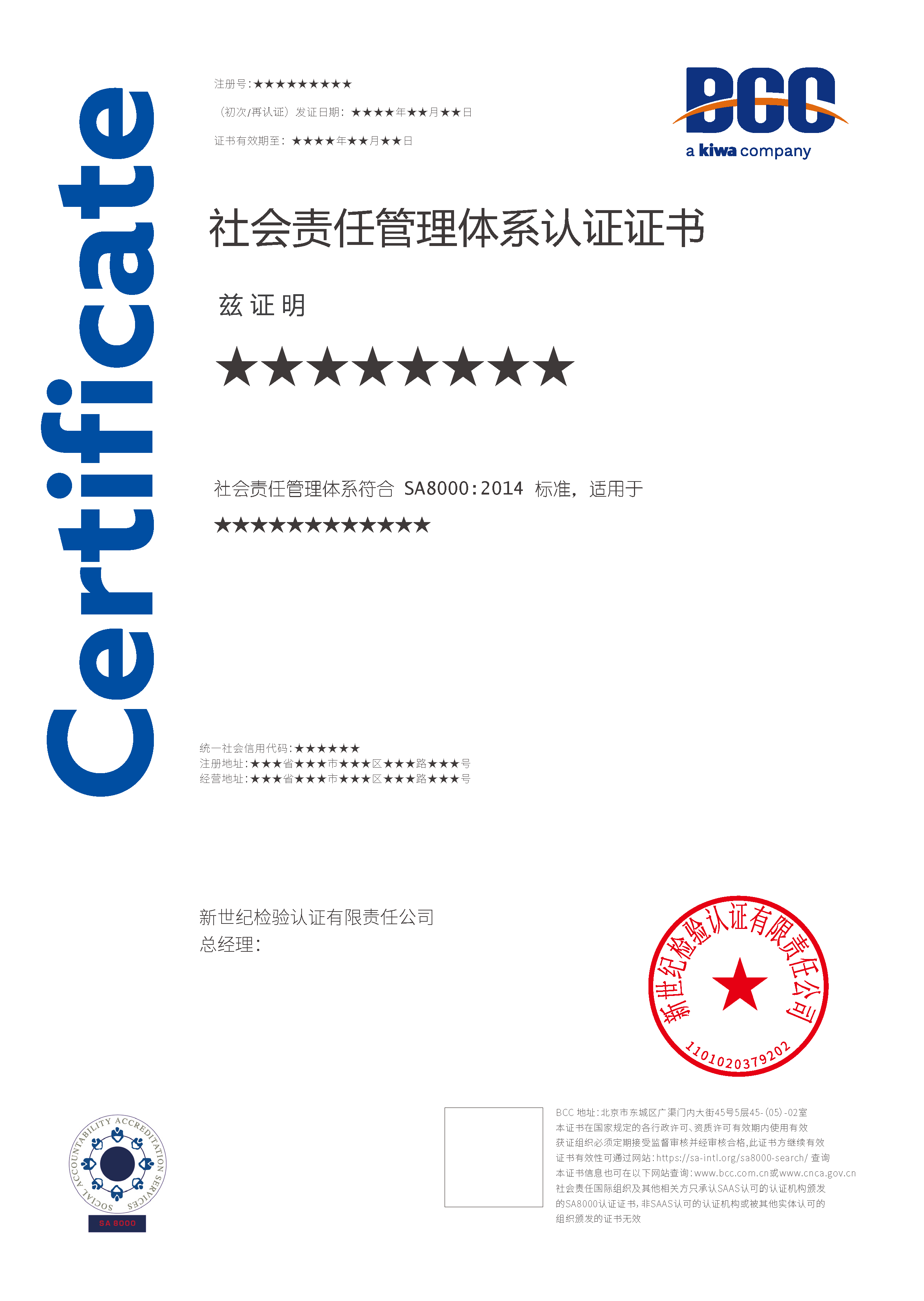 現(xiàn)行SA8000認(rèn)證使用的標(biāo)準(zhǔn)是SA8000:2014,該標(biāo)準(zhǔn)是由美國SAI(社會(huì)責(zé)任國際組織)制定發(fā)布的。SA8000標(biāo)準(zhǔn)涵蓋九個(gè)方面:童工、強(qiáng)迫勞動(dòng)、健康與安全、結(jié)社自由及集體談判的權(quán)利、歧視、懲罰措施、工作時(shí)間、報(bào)酬和管理體系。