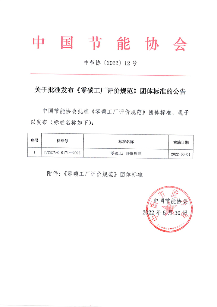 關(guān)于批準(zhǔn)發(fā)布《零碳工廠評(píng)價(jià)規(guī)范》團(tuán)體標(biāo)準(zhǔn)的公告