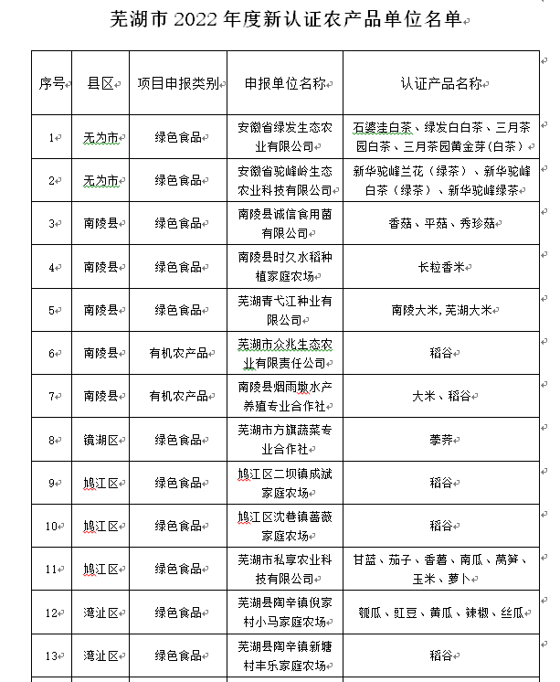 根據(jù)《蕪湖市農(nóng)業(yè)農(nóng)村局 蕪湖市財政局關于做好2022年省財政農(nóng)業(yè)高質量發(fā)展(“兩強一增”行動)項目實施工作的通知》(市農(nóng)計財〔2022〕60號)要求,經(jīng)縣(市)區(qū)農(nóng)業(yè)農(nóng)村部門申報,市農(nóng)業(yè)農(nóng)村局審核,擬對蕪湖市2022年度新認證綠色食品、有機農(nóng)產(chǎn)品、地理標志農(nóng)產(chǎn)品的29家單位進行公示。如下圖: