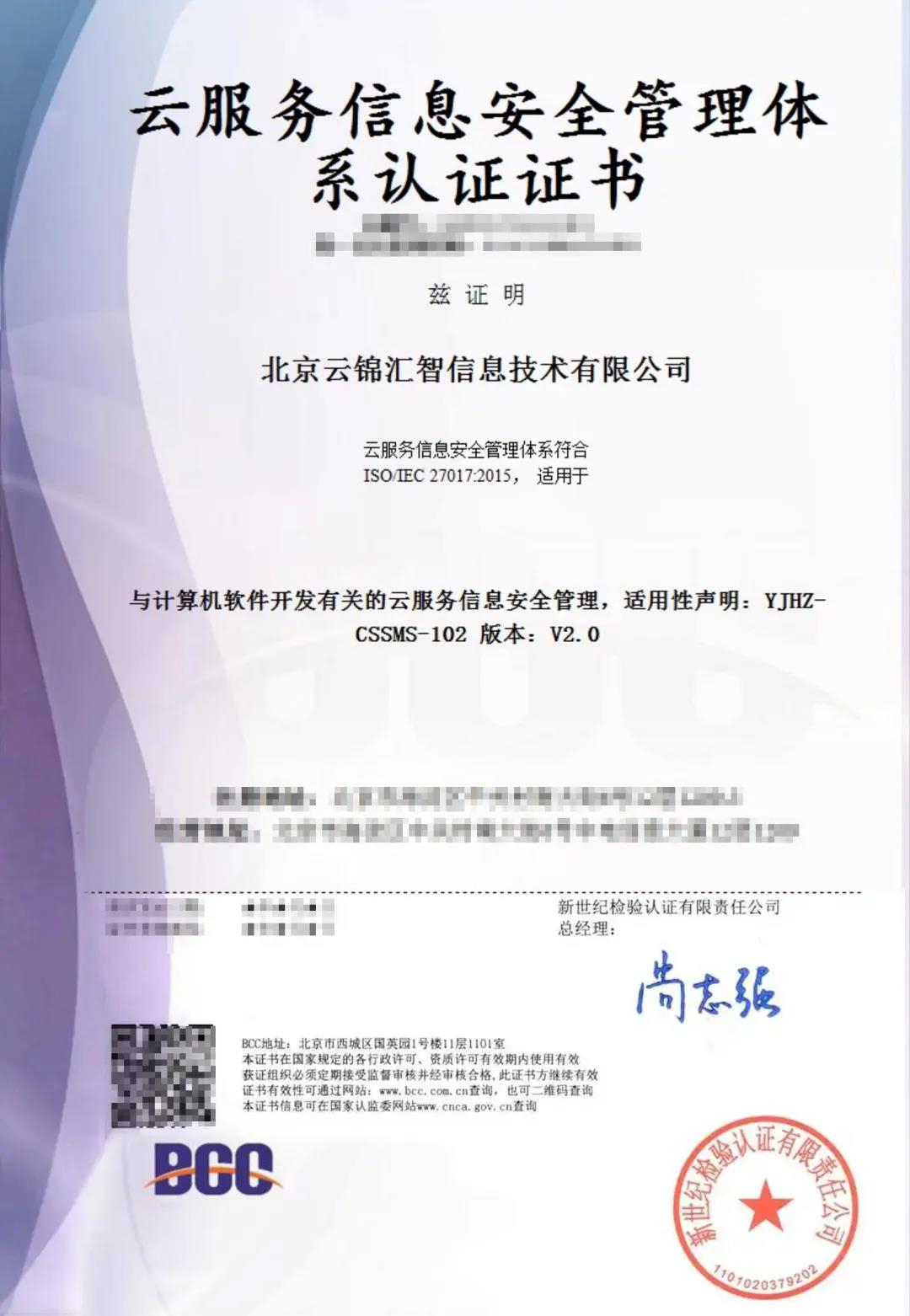 在云計算、云服務產(chǎn)業(yè)迅猛發(fā)展的大趨勢下,構(gòu)建云安全生態(tài)圈,建立相對完善的安全防護機制,發(fā)揮行業(yè)資源與能力優(yōu)勢,承擔科技企業(yè)責任是云錦匯智的發(fā)展理念。ISO/IEC 27017認證證書的獲得標志著云錦匯智繼個人身份信息(PII)保護達到了全球一定的標準后,在云服務提供商中信息安全管理水平處于前列。BCC為企業(yè)提供信息安全,隱私安全解決方案,助力云服務提供商安全可持續(xù)發(fā)展。