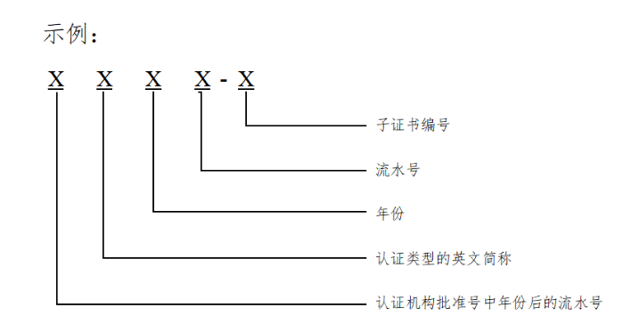 內(nèi)資認(rèn)證機(jī)構(gòu)認(rèn)證證書編號為該機(jī)構(gòu)批準(zhǔn)號的3位或4位阿拉伯?dāng)?shù)字流水號;外資認(rèn)證機(jī)構(gòu)認(rèn)證證書編號為F+該機(jī)構(gòu)批準(zhǔn)號的2位或3位阿拉伯?dāng)?shù)字流水號。