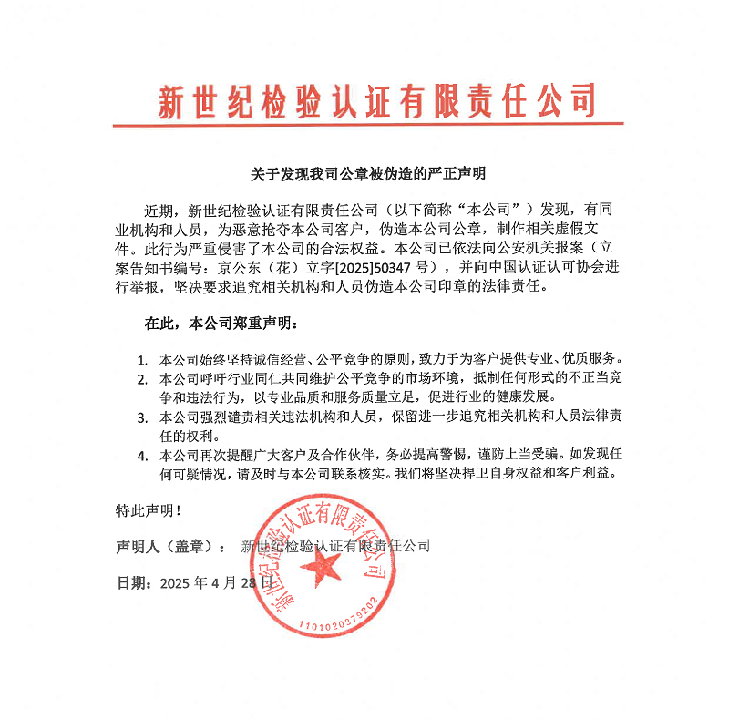 近期,新世紀(jì)檢驗(yàn)認(rèn)證有限責(zé)任公司(以下簡(jiǎn)稱 “本公司 ” )發(fā)現(xiàn),有同業(yè)機(jī)構(gòu)和人員,為惡意搶奪本公司客戶,偽造本公司公章,制作相關(guān)虛假文件。此行為嚴(yán)重侵害了本公司的合法權(quán)益。本公司已依法向公安機(jī)關(guān)報(bào)案(立案告知書編號(hào): 京公東(花)立字[2025]50347號(hào)),并向中國(guó)認(rèn)證認(rèn)可協(xié)會(huì)進(jìn)行舉報(bào),堅(jiān)決要求追究相關(guān)機(jī)構(gòu)和人員偽造本公司印章的法律責(zé)任。