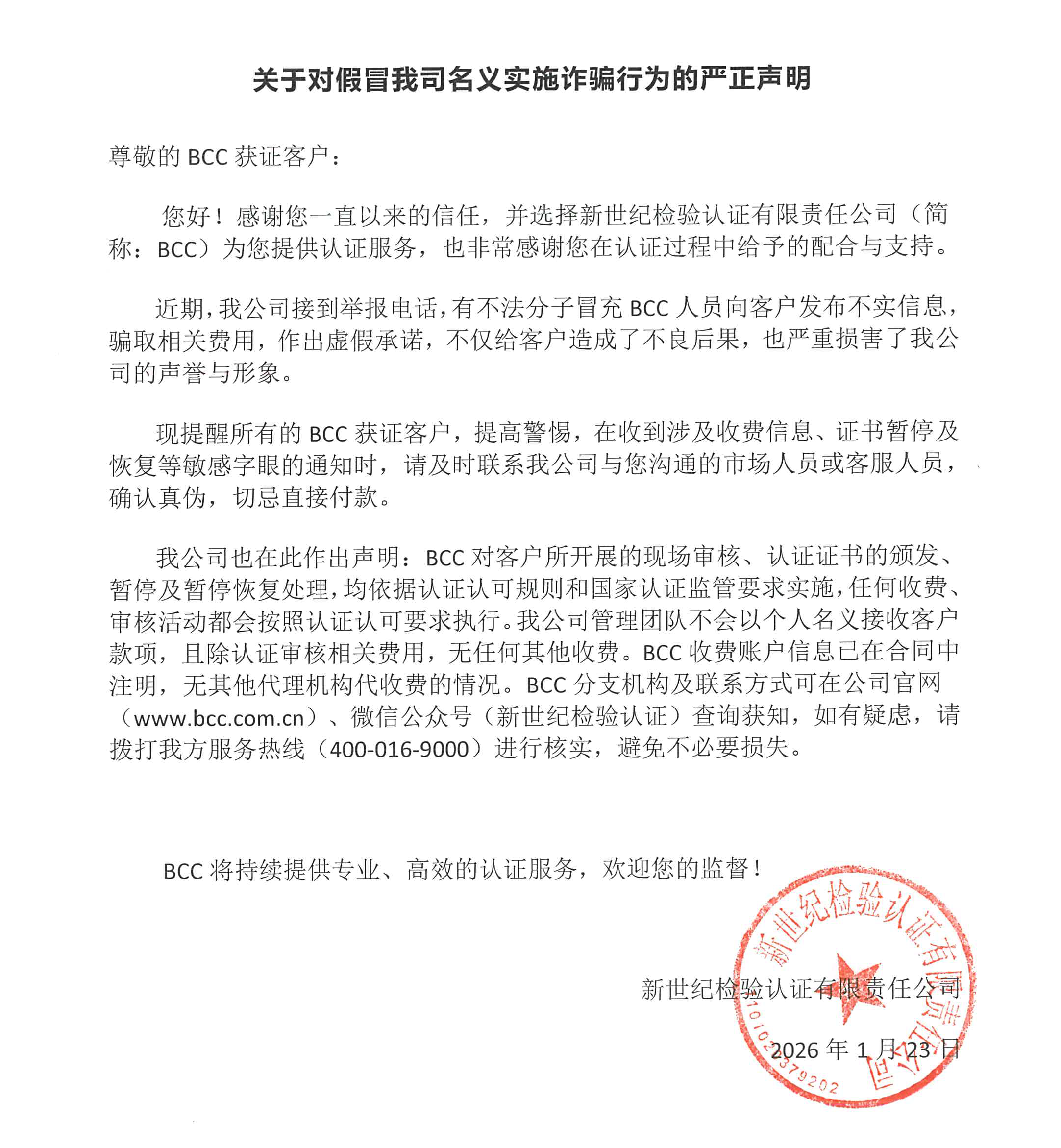 我公司也在此作出聲明:BCC對客戶所開展的現(xiàn)場審核、認證證書的頒發(fā)、暫停及暫?;謴吞幚?,均依據(jù)認證認可規(guī)則和國家認證監(jiān)管要求實施,任何收費、審核活動都會按照認證認可要求執(zhí)行。我公司管理團隊不會以個人名義接收客戶款項,且除認證審核相關費用,無任何其他收費。BCC收費賬戶信息已在合同中注明,無其他代理機構(gòu)代收費的情況。BCC分支機構(gòu)及聯(lián)系方式可在公司官網(wǎng)(m.anchixuan.com)、微信公眾號(新世紀檢驗認證)查詢獲知,如有疑慮,請撥打我方服務熱線(400-016-9000)進行核實,避免不必要損失。
